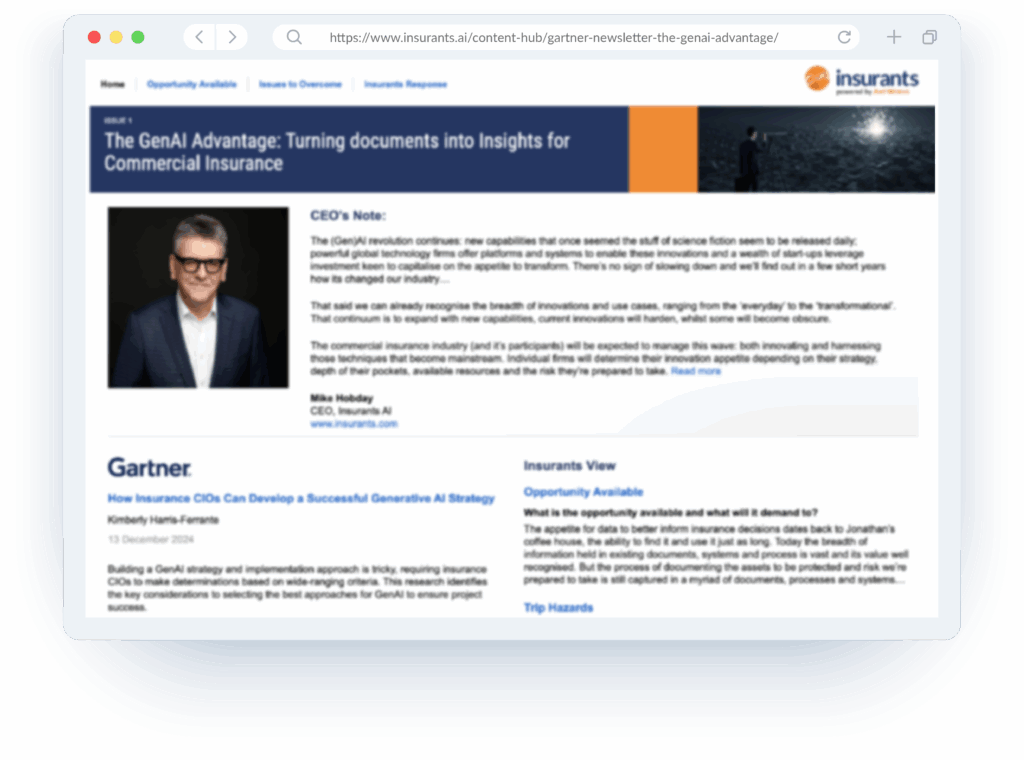 Stay ahead of the curve with our exclusive newsletter, created in collaboration with Gartner. Designed for forward-thinking insurance leaders, it delivers expert analysis on (Gen)AI adoption, real-world lessons, and strategies to drive business value without compromising focus. From unlocking document data to scaling enterprise-wide automation, discover how top insurers are navigating this rapidly evolving landscape.